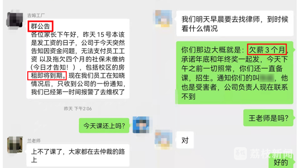 按照吉姆熊工作人员在家长群里发布的消息,公司本该在12月15日发工资,但突然告知因资金问题无法支付,而该机构已经拖欠员工3个月的工资和4个月的社保了。因此南京四校的老师选择停课维权,四个校区所涉及的近千名学生进而受到影响。