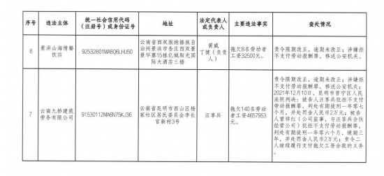 此次公布案件涉及的用人单位和个人,将推送信用中国和云南省信用信息共享平台,记入诚信档案,相关部门对失信行为进行联合惩戒。