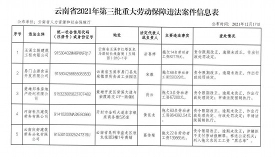 云南省人力资源和社会保障厅日前对外公布了2021年第三批重大劳动保障违法案件,本次公布的案件共7件,涉及7个用人单位。