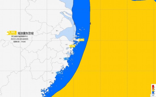 浙江省海洋监测预报中心24日16时发布海浪黄色警报:受寒潮影响,预计今天(24日)夜间到明天白天,近海海域:杭州湾有0.6到1.2米的轻浪,明天上午增大到1.5到2.4米的中浪;浙江北部有2.0到3.0米的中浪到大浪,明天上午增大到3.5到5.0米的大浪到巨浪;浙江中部有1.8到2.8米的中浪到大浪,明天下午增大到3.5到5.0米的大浪到巨浪;浙江南部有1.6到2.5米的中浪到大浪,明天下午增大到3.5到5.0米的大浪到巨浪。
