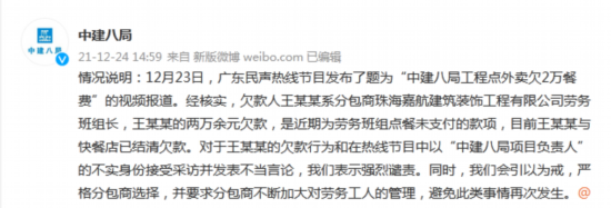 情况说明:12月23日,广东民声热线节目发布了题为“中建八局工程点外卖欠2万餐费”的视频报道。经核实,欠款人王某某系分包商珠海嘉航建筑装饰工程有限公司劳务班组长,王某某的两万余元欠款,是近期为劳务班组点餐未支付的款项,目前王某某与快餐店已结清欠款。对于王某某的欠款行为和在热线节目中以“中建八局项目负责人”的不实身份接受采访并发表不当言论,我们表示强烈谴责。同时,我们会引以为戒,严格分包商选择,并要求分包商不断加大对劳务工人的管理,避免此类事情再次发生。
