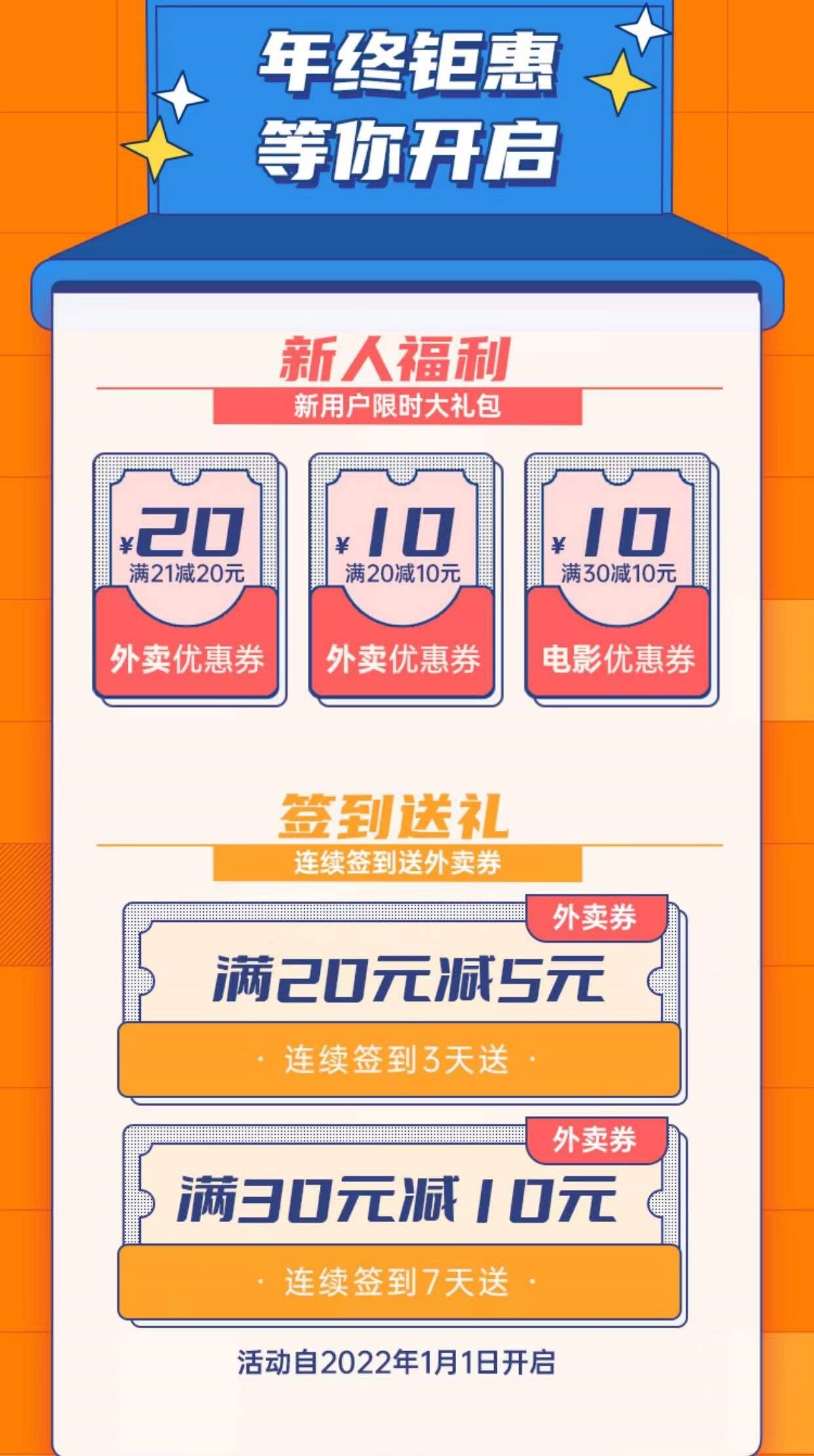 第三宠:活跃用户签到有礼。从2022年1月1日起,注册用户连续登陆APP签到,累计相应天数即可获得道具:外卖满减券。
