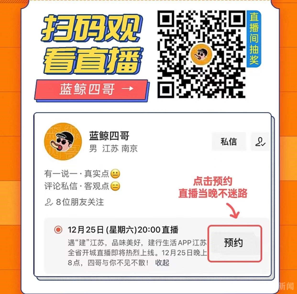 12月25号晚8点,聚焦“蓝鲸四哥”视频号直播间,遇“建”江苏,品味美好直播专场,福利派送、猜谜游戏、丰厚奖品不停息。更多的属地化福利、建行生活卡特权等将在直播当晚正式揭开神秘的豪华面纱,杭程与“蓝鲸四哥”将准时守候在直播间,与你不“建”不散。