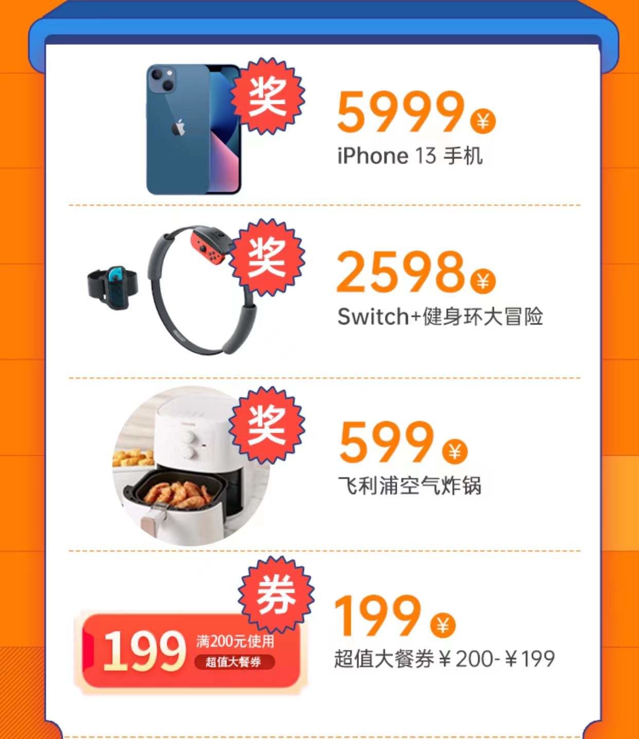 奖品当然是非常丰厚,包括不限于建行生活抱枕、无线充音乐床头灯、超值大餐福利券、飞利浦空气炸锅...更有锦鲤大奖——Switch+健身环大冒险3套和iPhone13 3台。并且每轮都会有满200-199元超值大餐券。