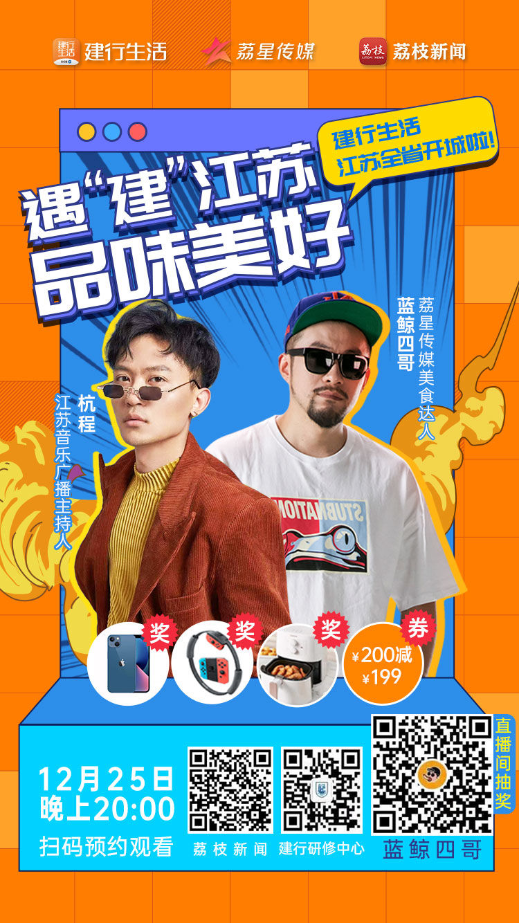12月25号晚上8点开始,建设银行江苏省分行、江苏广电旗下荔枝新闻、荔星传媒将携手奉上“遇‘建’江苏,品味美好”的直播盛筵。美好生活新选择,一“建”囊括不散装。