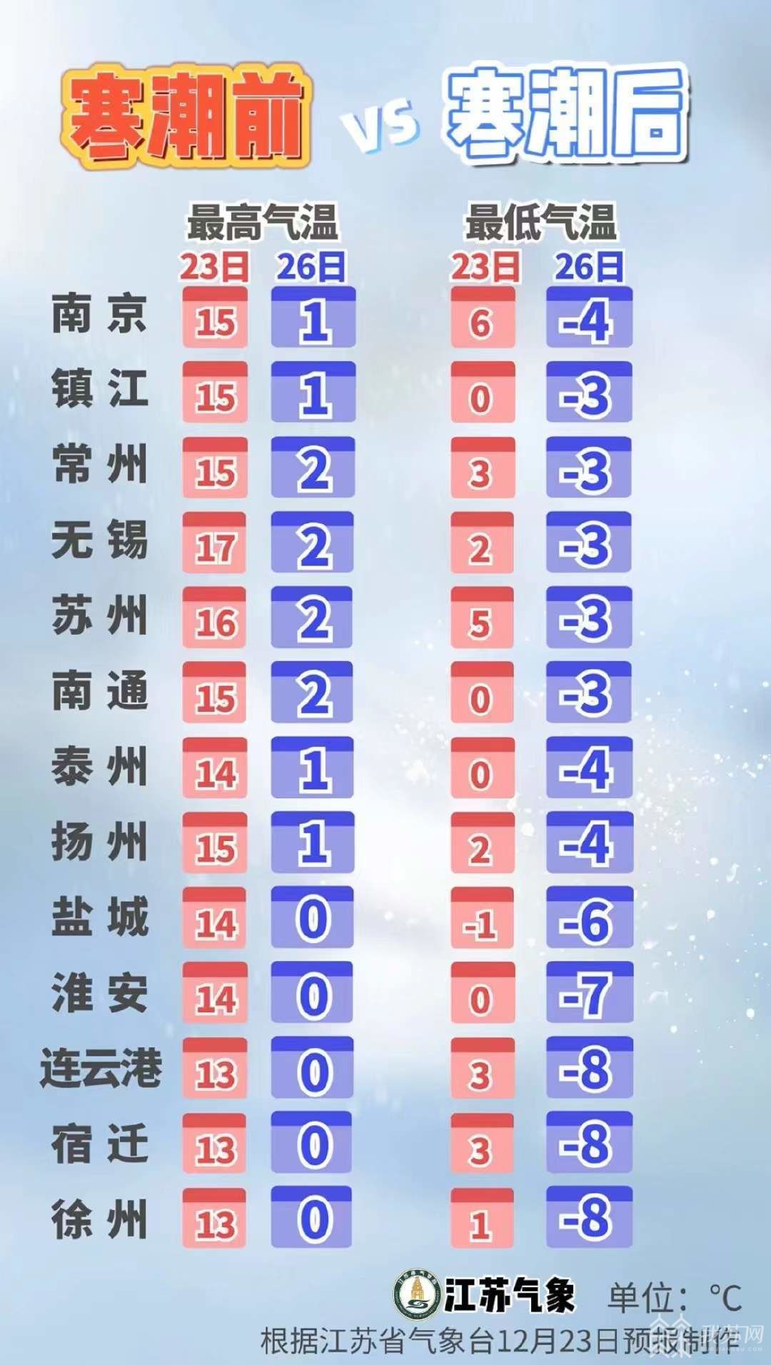 南京、徐州、宿迁、连云港、淮安、盐城、扬州、泰州、南通、镇江、常州、无锡和苏州48小时最低气温将下降10℃左右,并伴有陆上阵风5-7级、局地8级,江河湖海面阵风8-9级的偏北大风。