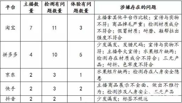 根据浙江消保委微信公众号发布,本次消费体察选择了淘宝、拼多多、京东、快手、抖音五大平台的17位主播,其中包括网络上颇具人气的李佳琦、罗永浩等。浙江省消保委购买商品共80个批次,并委托第三方权威机构按国家标准进行检测。检测后发现,本次购买样品中,29个批次不符合国家标准,不符合率为36.25%。比如,在淘宝平台的李佳琦,直播间内发现1批次商品标签不规范的问题。个别主播存在夸大宣传、用绝对性广告语、拿其他平台做比较、少发漏发、发错尺码、宣传与实物不一致等问题。记者在采访时,一些市民表示,直播购物主播的解说很有吸引力、价格听起来很优惠,但真正消费后,发现的确踩了一些"坑"。