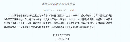 2022年陕西省全国硕士研究生招生考试将于12月25日(星期六)上午8:30开考。受疫情影响,仍有个别考生反映因种种原因无法跨市按时到达指定考点应考,此类考生可持本人准考证、身份证、48小时核酸检测阴性证明和个人书面情况说明(包括个人姓名、性别、身份证号、准考证号、原考点名称、无法应考原因、联系电话号码,承诺所提交信息真实可靠并签名),到距离最近的考点现场申请借考,由考点查核身份后紧急启用备用考场组织考试。