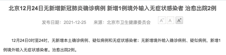 荔枝新闻讯 12月24日0时至24时,无新增本土确诊病例、疑似病例和无症状感染者;无新增境外输入确诊病例、疑似病例,新增1例境外输入无症状感染者。治愈出院2例。