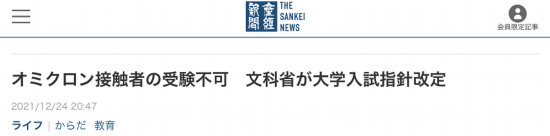 NHK报道称,目前,继大阪府之后,京都府、东京都也发现了奥秘克戎毒株社区传播病例。截至文部科学省修改防疫规定之前,在具备核酸检测结果呈阴性、考试当天没有发病症状、能够避开公共交通前往考场这3个条件的情况下,新冠确诊病例的密切接触者能够在单独房间内接受考试。不过,在修改后的规定中,加入了不允许奥秘克戎毒株的密切接触者参加考试的项目。