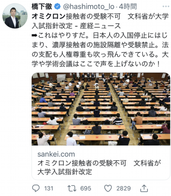 关于该规定,有日媒称,这将影响于明年1月15、16日进行的日本全国共通大学升学考试与大学独自设置的升学考试。关于补考等相关事宜,文部科学省称:“将继续探讨应对方案。” 文部科学省的最新规定在日本网络上引来巨大争议,有大量日本网民抨击称“日本政府必须将这条规定撤回”“这是歧视性规定”“践踏临考学生的努力”等等,有人说:“如果这是日本政府主导探讨出的规定,那政府以后再也不要提及‘年轻人的将来’了。”日本维新会前代表桥下彻则在推特上批评称:日本文部科学省的最新规定“里面完全看不到 ‘法治’和‘尊重人权’,日本大学和学术会议现在还不发声(更待何时)?”