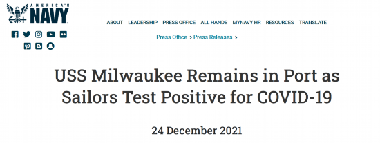 据报道,美国海军在平安夜发布声明证实,“密尔沃基号”战斗舰上一些舰员的新冠检测呈阳性,感染者出现轻微症状,已经与其他舰员隔离,但目前都留在船上,“密尔沃基号”目前停靠在关塔那摩湾海军基地。RT称,美国海军拒绝透露有多少人感染新冠病毒,但吹嘘舰员接种的新冠疫苗“继续证明了对严重疾病的有效性”。