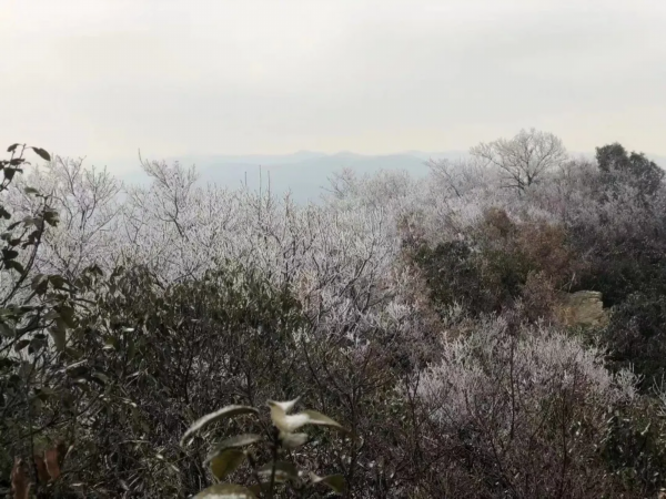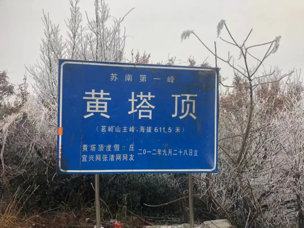 张渚茗岭山主峰黄塔顶上的树木也挂满了积雪。