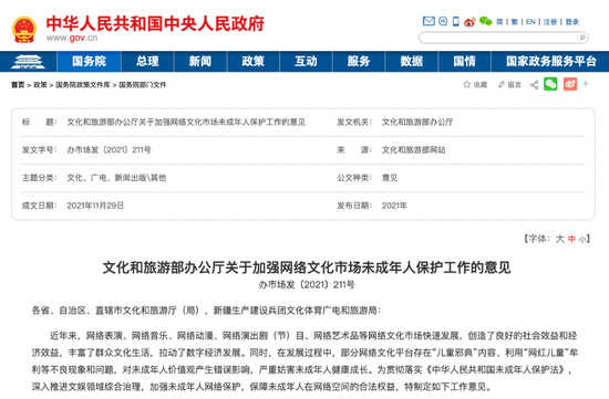 11月29日,文化和旅游部发布《关于加强网络文化市场未成年人保护工作的意见》,提出严禁借“网红儿童”牟利。对出现未成年人单独出镜或者由成年人携带出镜超过一定时长且经核定为借助未成年人积累人气、谋取利益的直播间或者短视频账号,或者利用儿童模特摆出不雅姿势、做性暗示动作等吸引流量、带货牟利的账号依法予以严肃处理。