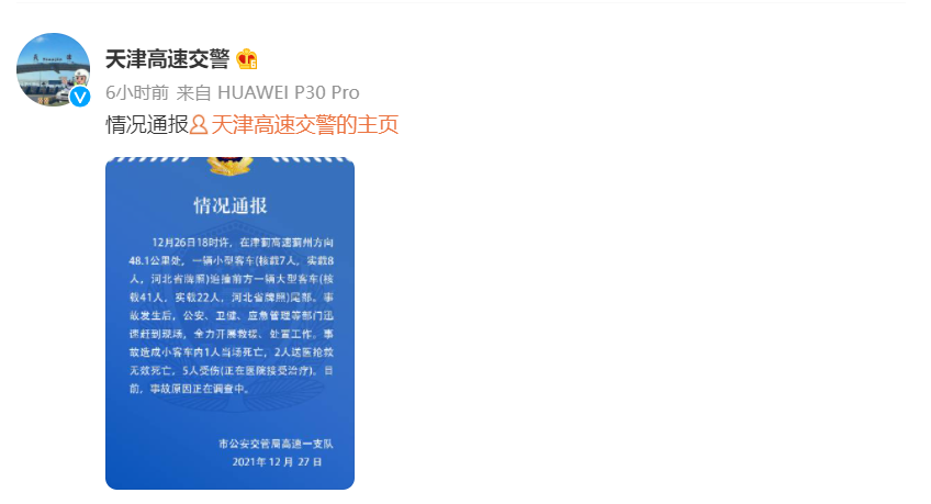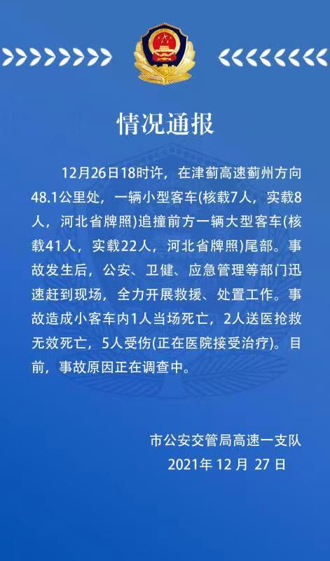 荔枝新闻讯 据天津市公安交通管理局高速支队官方微博“天津高速交警”消息,12月26日18时许,在津蓟高速蓟州方向48.1公里处,一辆小型客车(核载7人,实载8人,河北省牌照)追撞前方一辆大型客车(核载41人,实载22人,河北省牌照)尾部。事故发生后,公安、卫健、应急管理等部门迅速赶到现场,全力开展救援、处置工作。事故造成小客车内1人当场死亡,2人送医抢救无效死亡,5人受伤(正在医院接受治疗)。目前,事故原因正在调查中。