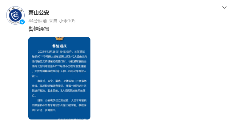 荔枝新闻讯 据@萧山公安 微博消息,2021年12月26日11时33分许,刘某某驾驶浙A7***5号牌大货车沿萧山区时代大道由北向南行驶至义桥镇东旭街路口时,与孔某驾驶的由南向北左转弯的浙A8* *Y号牌小型客车发生碰撞大货车侧翻导致两名行人和一名电动车驾驶人被压。