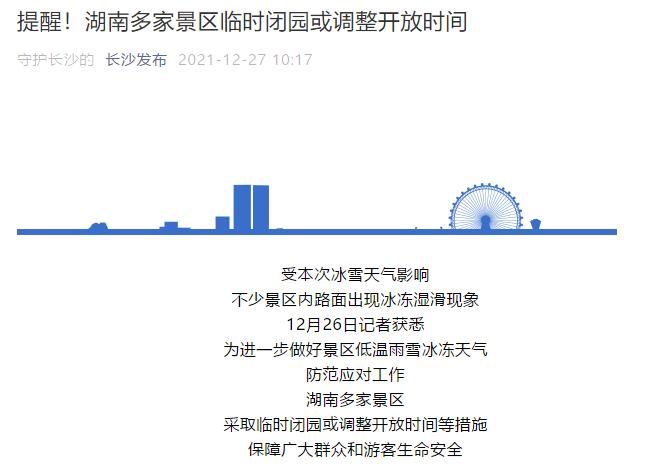 荔枝新闻讯 据“长沙发布”微信公众号消息,受本次冰雪天气影响,不少景区内路面出现冰冻湿滑现象,为进一步做好景区低温雨雪冰冻天气防范应对工作,湖南多家景区采取临时闭园或调整开放时间等措施,保障广大群众和游客生命安全。