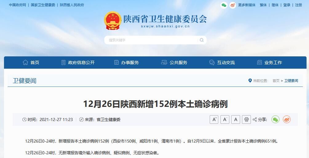 荔枝新闻讯 据陕西卫健委官网消息,12月26日0—24时,陕西新增报告本土确诊病例152例(西安市150例、咸阳市1例、渭南市1例)。自12月9日以来,全省累计报告本土确诊病例651例。