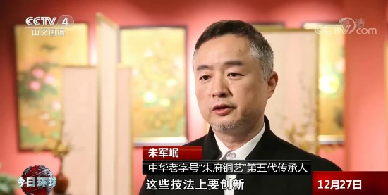 中华老字号“朱府铜艺”第五代传承人 朱军岷:要不断地超越前人的技法,创造出一些符合现代(的技法),包括科技也好,现代手法也好,这些技法上要创新。第二就是使用场景,使用场景这个创新很重要。文化内涵也要不断地创新,也要不断地去继承发扬。