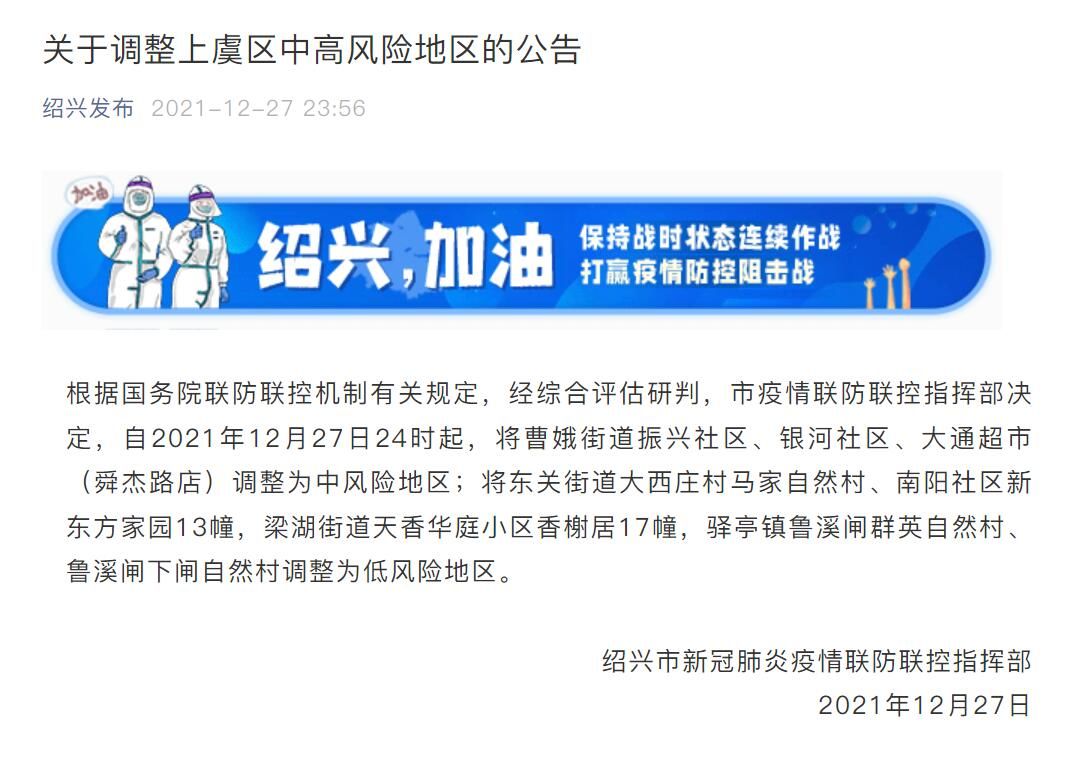 荔枝新闻讯 据“绍兴发布”微信公众号消息,根据国务院联防联控机制有关规定,经综合评估研判,绍兴市疫情联防联控指挥部决定,自2021年12月27日24时起,将曹娥街道振兴社区、银河社区、大通超市(舜杰路店)调整为中风险地区;将东关街道大西庄村马家自然村、南阳社区新东方家园13幢,梁湖街道天香华庭小区香榭居17幢,驿亭镇鲁溪闸群英自然村、鲁溪闸下闸自然村调整为低风险地区。