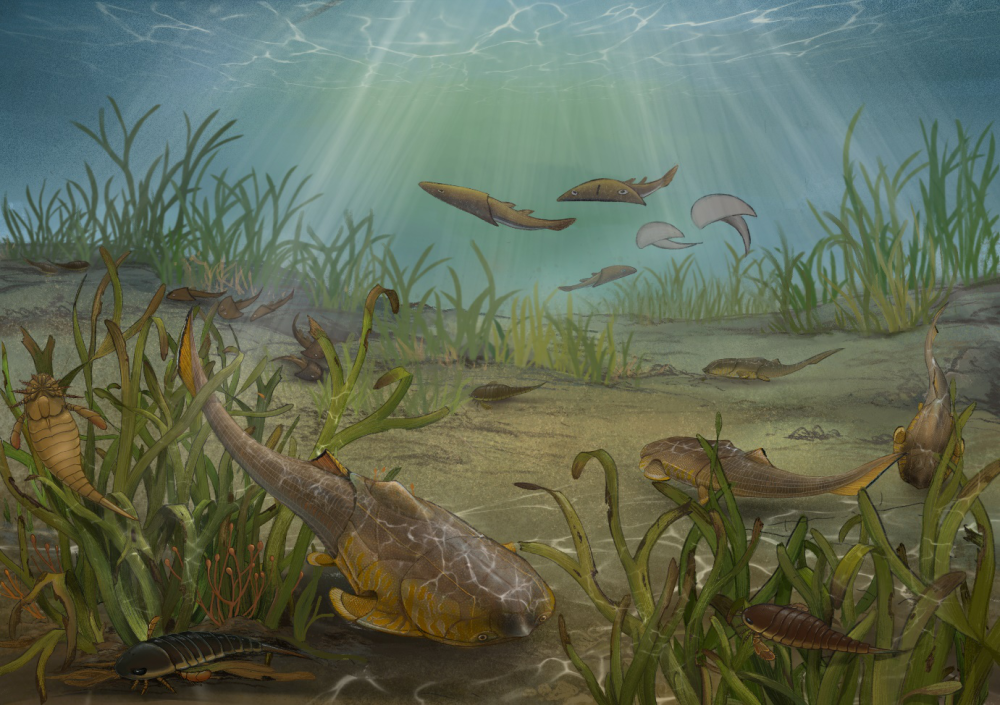 重庆秀山罗德洛世动物群生态复原图。郑秋旸绘,中科院古脊椎动物与古人类研究所供图