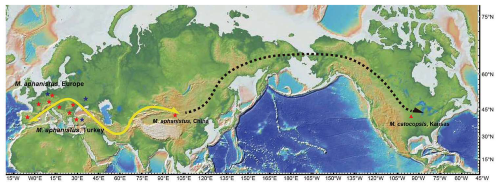 剑齿虎属自欧亚向北美的迁移示意图。中科院古脊椎所供图