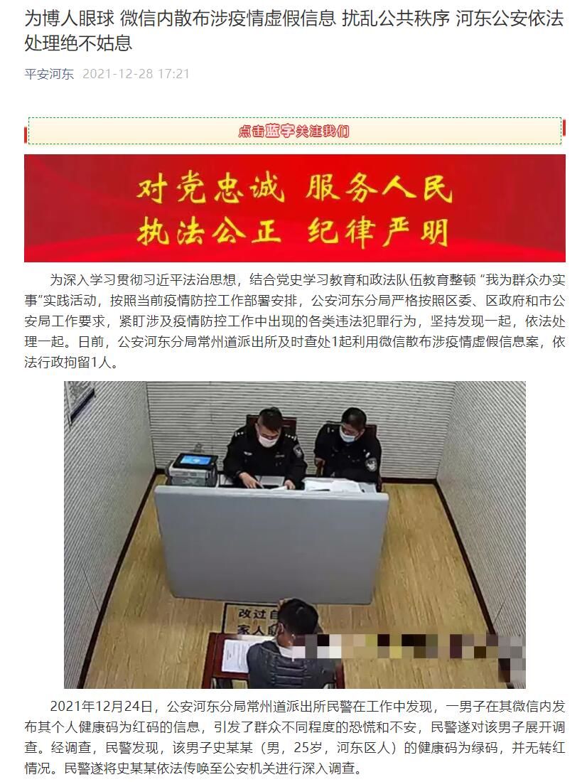 2021年12月24日,公安河东分局常州道派出所民警在工作中发现,一男子在其微信内发布其个人健康码为红码的信息,引发了群众不同程度的恐慌和不安,民警遂对该男子展开调查。经调查,民警发现,该男子史某某(男,25岁,河东区人)的健康码为绿码,并无转红情况。民警遂将史某某依法传唤至公安机关进行深入调查。