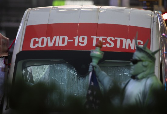 12月20日,一名街头演员在美国纽约时报广场一处临时核酸检测点旁表演。新华社 图
