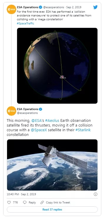 3个月后,也就是2019年9月2日,欧洲航天局发布推文,描述了气象卫星“风神”同“星链-44”卫星一次遭遇:“有史以来第一次,欧洲航天局进行了‘紧急避碰’操作。”那一回,“风神”提高了飞行高度,越过了“星链-44”,安全避险。