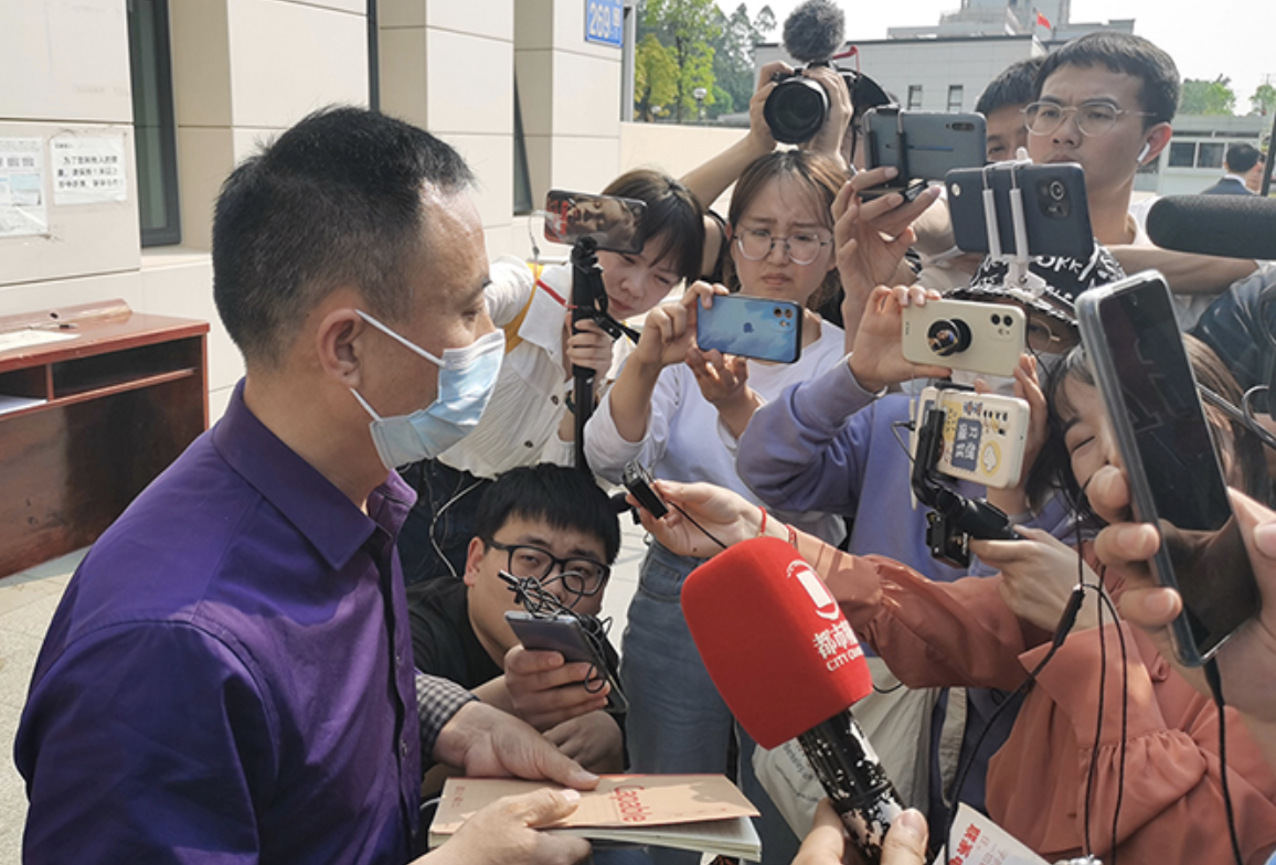 2021年3月26日庭审结束后,被拐儿童父亲申军良在法院门口接受媒体采访。
