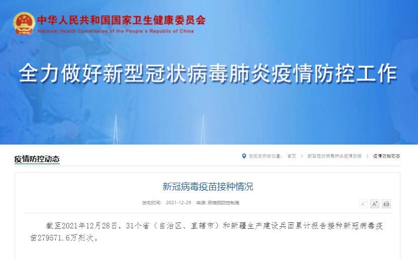 据国家卫健委网站消息,截至2021年12月28日,31个省(自治区、直辖市)和新疆生产建设兵团累计报告接种新冠病毒疫苗279571.6万剂次。