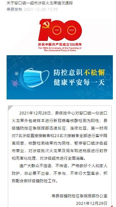 2021年12月28日,县疾控中心对窑口镇一份进口火龙果外包装样本进行新冠病毒核酸检测为阳性,县疫情防控应急指挥部迅速反应、连夜处置,第一时间对7名涉疫直接接触者和23名次接触者全部进行集中隔离观察,核酸检测结果均为阴性,暂停窑口镇涉疫超市营业,对涉疫批次火龙果及同车购进物品进行封存和无害化处理,对涉疫超市进行全面消毒。