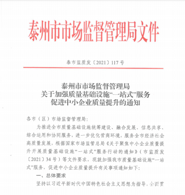 在市场监管总局的统一部署下,眼下全国各地正在积极开展质量基础设施“一站式”服务行动。记者从泰州市市场监管局了解到,近日,该局印发了《关于加强质量基础设施“一站式”服务 促进中小企业质量提升的通知》,全面部署泰州市质量基础设施“一站式”服务工作,推动质量基础设施与企业、产业同发展、共壮大,着力打通服务的“最后一公里”。