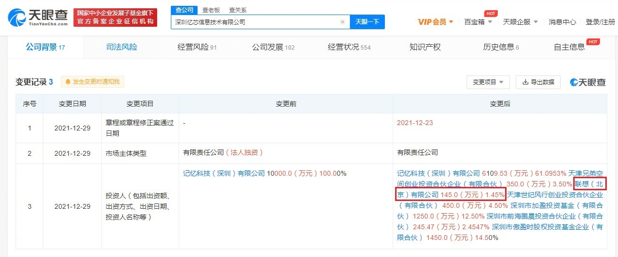 荔枝新闻讯 天眼查显示,深圳忆芯信息技术有限公司发生工商变更,新增联想(北京)有限公司等为股东。深圳忆芯信息技术有限公司成立于2021年11月,经营范围包括集成电路芯片及产品制造等。