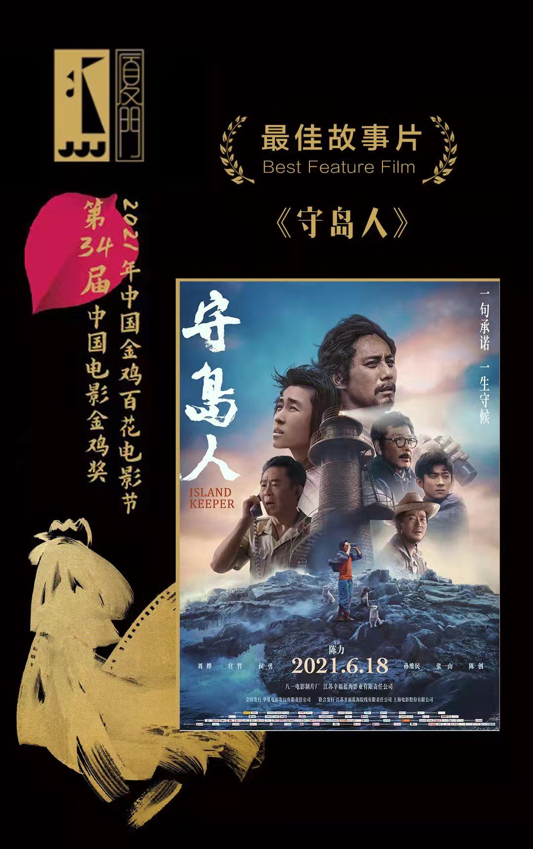 荔枝新闻讯 12月30日晚,第34届中国电影金鸡奖颁奖典礼暨2021年中国金鸡百花电影节闭幕式在福建厦门举行。电影《守岛人》斩获第34届中国电影金鸡奖最佳故事片奖。