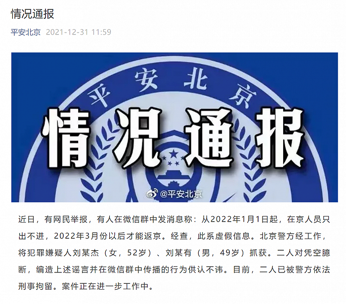 荔枝新闻讯 据“平安北京”微信公众号12月31日消息,近日,有网民举报,有人在微信群中发消息称:从2022年1月1日起,在京人员只出不进,2022年3月份以后才能返京。经查,此系虚假信息。北京警方经工作,将犯罪嫌疑人刘某杰(女,52岁)、刘某有(男,49岁)抓获。二人对凭空臆断,编造上述谣言并在微信群中传播的行为供认不讳。目前,二人已被警方依法刑事拘留。案件正在进一步工作中。
