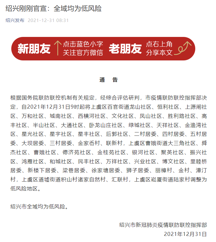 荔枝新闻讯 12月31日,“绍兴发布”微信公众号发布通告:自2021年12月31日9时起,绍兴市部分区域的疫情风险等级调整为低风险地区,至此,绍兴市全域均为低风险。通告全文如下: