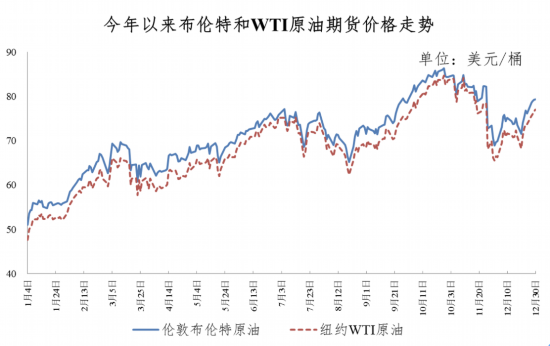 从2021年情况看,全球经济从疫情中逐步复苏,原油需求较快增长。但“欧佩克+”克制增产、美国原油产量不及疫前,产油国整体产能释放缓慢,导致全球原油产需关系偏紧,支撑全年油价呈上涨走势。在这期间,新冠肺炎病毒在海外持续蔓延并不断变异,每一次疫情的恶化或突变均带来油价大幅震荡。截至年底,伦敦布伦特、纽约WTI原油期货价格分别为每桶79美元、77美元,与年初相比分别上涨55%、62%。