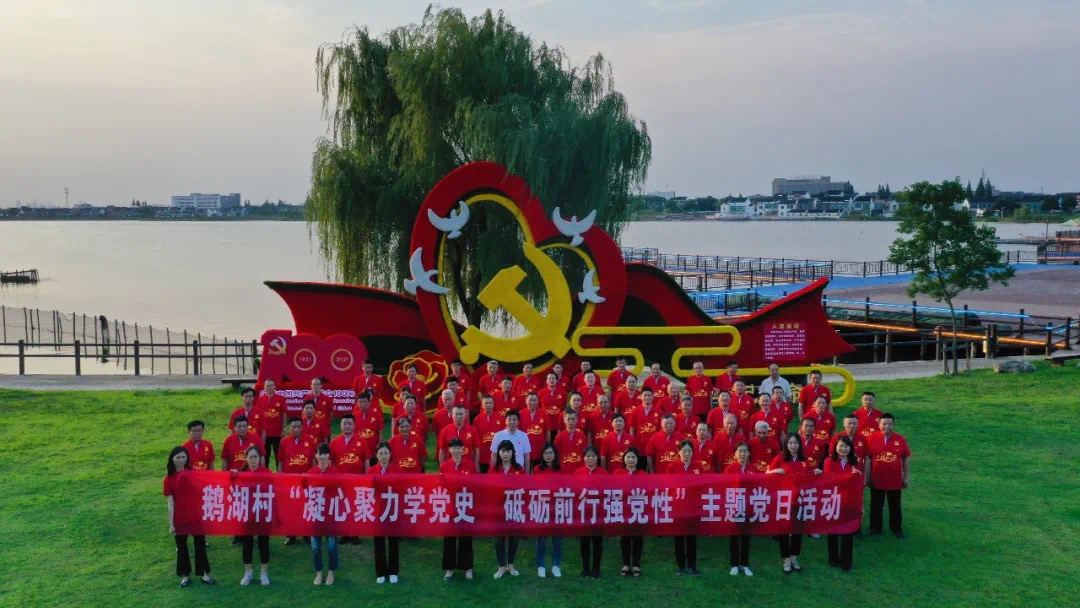 鹅湖村推动党建引领乡村思想文化阵地建设,贯彻落实“两山理论”,涵养人文+环境的生态宜居“韵水”。用好新时代文明实践站,举办道德讲堂、移风易俗活动,利用核心价值观促进淳朴民风;通过“鹅湖好人”“文明家庭”评选推荐,让榜样力量带动良好家风;开展党建志愿服务、红色好书下乡活动,让精神文化提升文明乡风。以“美丽鹅湖”创建为目标、水环境治理为主线,以点带面串联推动河道治理、南青荡景观带综合提升、特色田园人居环境综合整治,助力“看得见水、挽地住诗意、留得住乡愁”的水乡生态建设,推动党建引领的“共建共治共享”生态治理新格局。