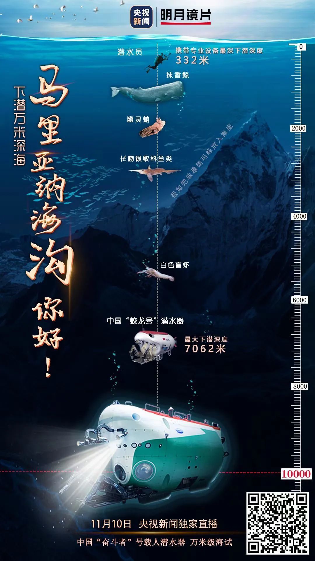 2020年11月10日,中国“奋斗者”号载人潜水器再下万米深海,由“打光拍照”的“御用摄影师”——“沧海”号和“凌云”号拍下了万米深海的画面。为大家带来了来自马里亚纳海沟的“奋斗者”问候。