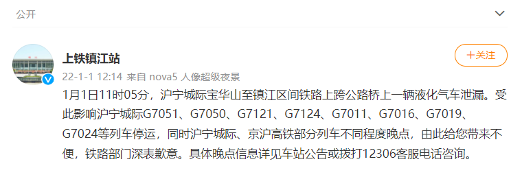 荔枝新闻讯 上海铁路局镇江站官方微博1月1日消息,1月1日11时05分,沪宁城际宝华山至镇江区间铁路上跨公路桥上一辆液化气车泄漏。受此影响沪宁城际G7051、G7050、G7121、G7124、G7011、G7016、G7019、G7024等列车停运,同时沪宁城际、京沪高铁部分列车不同程度晚点,由此给您带来不便,铁路部门深表歉意。具体晚点信息详见车站公告或拨打12306客服电话咨询。