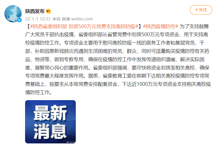 荔枝新闻讯 “陕西发布”微博1月1日消息,为了支持鼓舞广大党员干部抗击疫情,省委组织部从省管党费中划拨500万元专项资金,用于支持高校疫情防控工作。专项资金主要用于慰问高校防疫一线的医务工作者和基层党员、干部,补助因患新冠肺炎而遇到生活困难的党员、群众,同时可适量购买疫情防控有关药品、物资等,做到专款专用,确保在疫情防控工作中发挥传递组织温暖、解决实际困难、凝聚党心民心的重要作用。省委组织部强调,要尽快将资金划拨至相关高校,确保专项党费最大程度发挥作用。据悉,省委教育工委在前期下达相关高校疫情防控专项党费基础上,按要求从本级党费安排配套资金,下达近1000万元专项资金支持相关高校疫情防控工作。