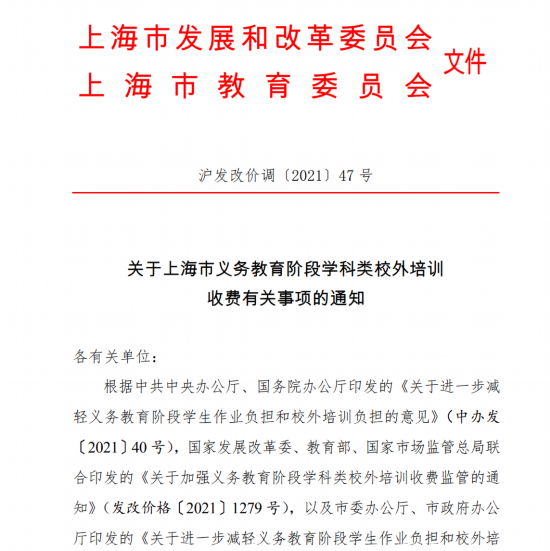 2021年12月31日,上海市发改委会同上海市教委联合印发的《关于上海市义务教育阶段学科类校外培训收费有关事项的通知》在上海市人民政府网站公布:线上班收费标准为20元/课时·人次;10人以下线下班收费标准为80元/课时·人次;10-35人线下班收费标准为60元/课时·人次;35人以上线下班收费标准为40元/课时·人次。该收费标准自上海中小学2022年春季学期开学(2022年2月17日)起施行。
