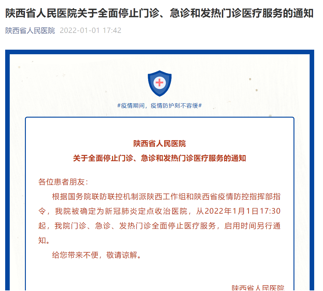 根据国务院联防联控机制派陕西工作组和陕西省疫情防控指挥部指令,我院被确定为新冠肺炎定点收治医院,从2022年1月1日17:30起,我院门诊、急诊、发热门诊全面停止医疗服务,启用时间另行通知。