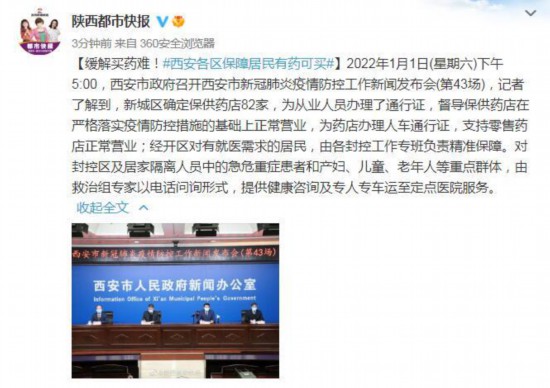 【缓解买药难!#西安各区保障居民有药可买#】2022年1月1日(星期六)下午5:00,西安市政府召开西安市新冠肺炎疫情防控工作新闻发布会(第43场),记者了解到,新城区确定保供药店82家,为从业人员办理了通行证,督导保供药店在严格落实疫情防控措施的基础上正常营业,为药店办理人车通行证,支持零售药店正常营业;经开区对有就医需求的居民,由各封控工作专班负责精准保障。对封控区及居家隔离人员中的急危重症患者和产妇、儿童、老年人等重点群体,由救治组专家以电话问询形式,提供健康咨询及专人专车运至定点医院服务。