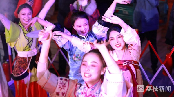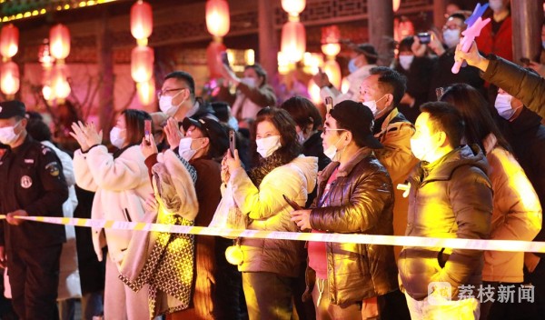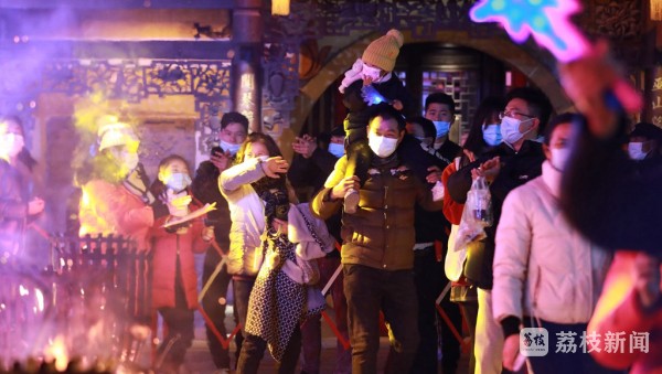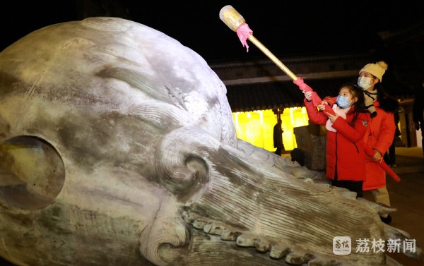 夜幕降临,作为秦淮之源的江苏句容宝华山脚下的千华古村各式彩灯依次点亮,流光溢彩,美不胜收。古戏台的中央燃起了熊熊篝火,随着火苗跳跃的节奏,人们围着篝火载歌载舞,欢笑映在人们脸上。舞台上,各种特色节目连番登台,高颜值的舞蹈、超酷的乐队表演、趣味的情景时装秀精彩上演,让人们体验到了山林古村中不一样的“跨年夜”。熊熊的篝火照在每个人的脸上,把幸福的表情映的透亮。在辞旧迎新的美好时刻,游客们举起铜锤,敲响比成人还高的巨大青铜“木鱼”,祝福新的一年顺遂;并许下了新年里新的愿望。