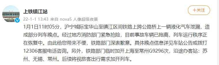 据上海铁路局镇江站官方微博消息,1月1日11时05分,沪宁城际宝华山至镇江区间铁路上跨公路桥上一辆液化气车泄漏,造成部分列车晚点。经过地方消防部门紧急抢险,目前事故车辆已拖离,列车运行秩序正在恢复中。由此给您带来不便,铁路部门深表歉意。具体晚点信息详见车站公告或拨打12306客服电话咨询。另外,铁路部门临时加开上海至常州G9296次,沿途办客站:苏州、无锡、常州。后续将视旅客出行需求加开列车。