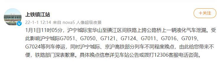 1月1日,据上海铁路局镇江站官方微博消息,1月1日11时05分,沪宁城际宝华山至镇江区间铁路上跨公路桥上一辆液化气车泄漏。受此影响沪宁城际G7051、G7050、G7121、G7124、G7011、G7016、G7019、G7024等列车停运,同时沪宁城际、京沪高铁部分列车不同程度晚点,由此给您带来不便,铁路部门深表歉意。具体晚点信息详见车站公告或拨打12306客服电话咨询。