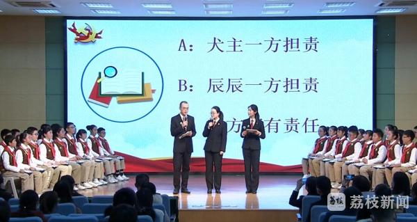 情景剧中,一名小朋友逗了一只脱绳的烈性犬后被咬伤,而对于这件事应该由谁负责的问题,现场讨论地非常热烈,持不同观点的同学们也都有理有据,对此,法官们也做出了详细的解答。