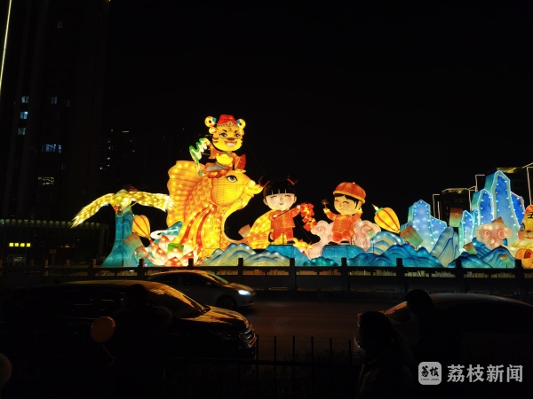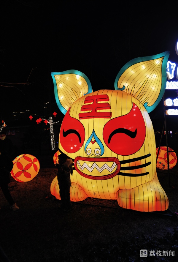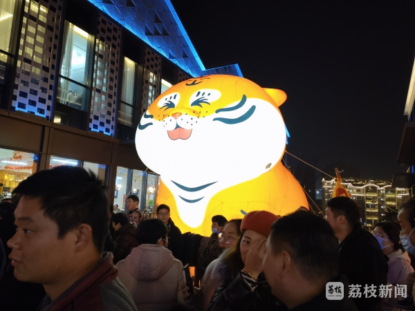 溧水宝塔公园的古塔永寿塔下,大型灯组瑞虎迎春闪耀,长11.5米的灯组呈现出十二生肖贺岁的画面,一只高大威武的老虎站在C位,十分霸气。据了解,这组灯彩是溧水灯会最大的一组寅虎花灯,祝愿观灯游客虎年虎虎生威。